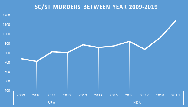 Murder and lynching if SC-ST men and women have been increasing every year due the dominant caste mentality that they can get away with murders because their castd men are in police and judiciary and powerful politicians brlongs to their community.Low rate of conviction in murder cases is also responsible for psychic of perpetrators of crimes that they will easily get away with use on money and muscle. This is also the failure of Justice system in India. Awareness about rights of SC-ST Community and provisions of law and atrocitiy act is also responsible for registration of murder cases by families of the victims.