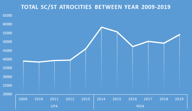 Line chart showing trend of total atrocity cases against SC/ST between year 2009 to 2019 with clear separation of UPA(Congress lead) and NDA(BJP lead) government periodsTotal Crimes | Report from 2009 - 2019